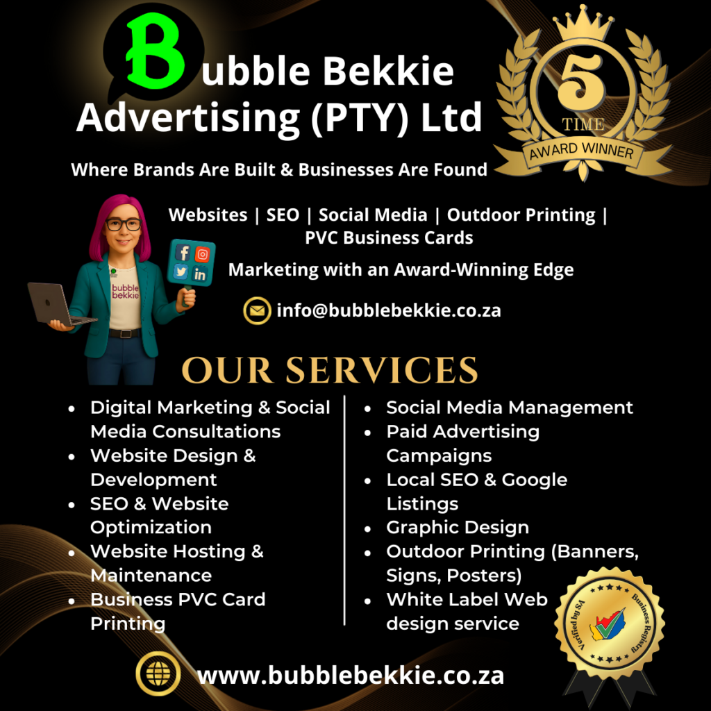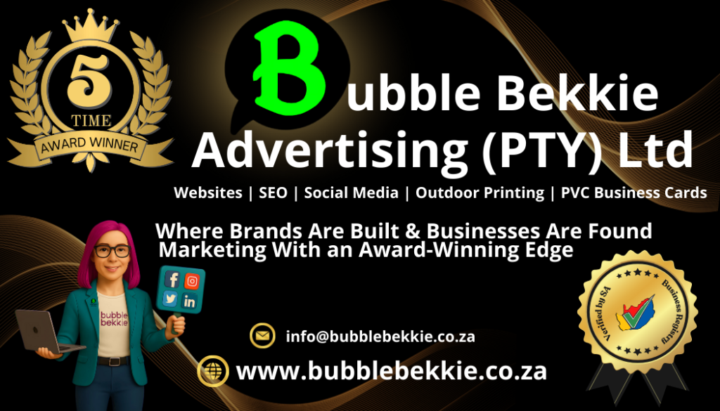 Bubble Bekkie Advertising (PTY) Ltd is an award-winning digital marketing, web design, and branding agency founded in 2020 in South Africa. What began as a small, purpose-driven business has grown into a trusted marketing partner for small and medium-sized businesses, entrepreneurs, start-ups, and agencies across South Africa and internationally, including clients in Australia and beyond.