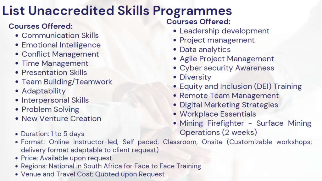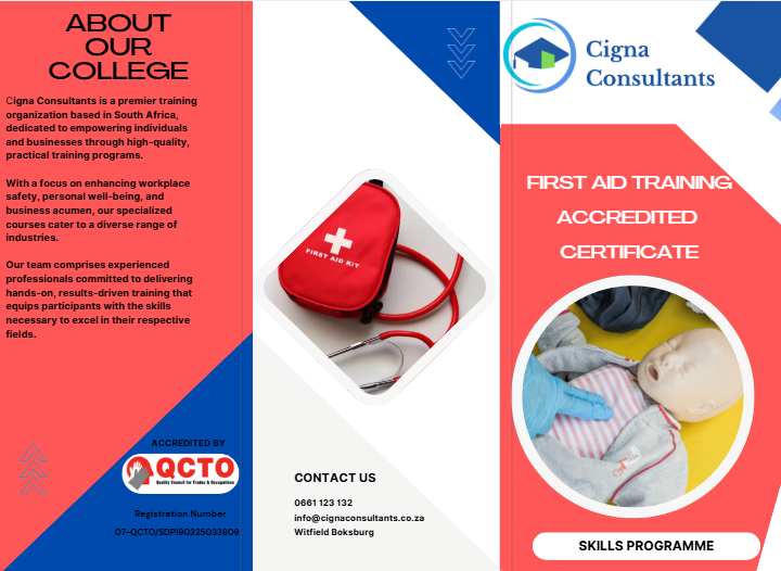 Cigna Consultants is a premier training organization based in Boksburg South Africa, dedicated to empowering individuals and businesses through high-quality, practical training programs. With a focus on enhancing workplace safety, personal well-being, and business acumen, our specialized courses cater to a diverse range of industries. Our team comprises experienced professionals committed to delivering hands-on, results-driven training that equips participants with the skills necessary to excel in their respective fields.